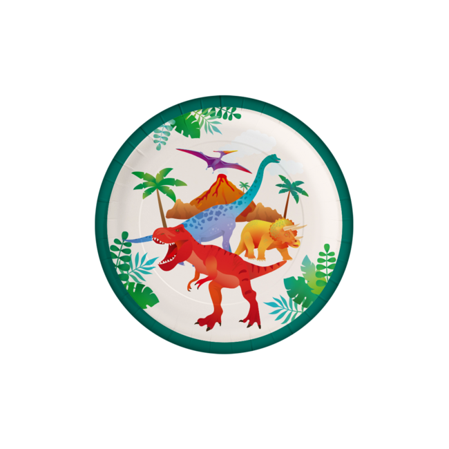 De set bevat 8 stevige bordjes met stoer dinosaurus design en een doorsnede van 23 cm.