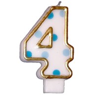 Cijferkaarsje 4 met gouden rand en blauwe stippen.