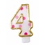 Cijferkaarsje 4 met gouden rand en roze stippen.