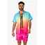 korte broek en overhemd in felle kleuren blauw, groen, oranje en roze.