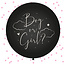 Zwarte gender reveal ballon (61 cm) met sierlijke beige Boy or Girl-print en wolkjes.