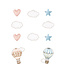 Met pastel luchtballonnetjes, roze hartjes en blauwe sterretjes.