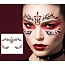 vol glimmende zwarte en rode steentjes in een gothic vorm.