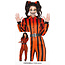 Een oranje jumpsuit met zwarte strepen en bijpassende riem.