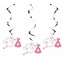 3 vrolijke ooievaartjes die bungelen aan een zilver glimmende swirl decoratie.