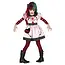 Dit Halloween kostuum Possessed Doll voor kinderen bestaat uit een roze jurkje met stiksels, tiara, ooglapje, riem en wit-rood gestreepte kousen en mouwen.