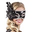 Zwart glitter oogmasker met grote bloem met veertjes.