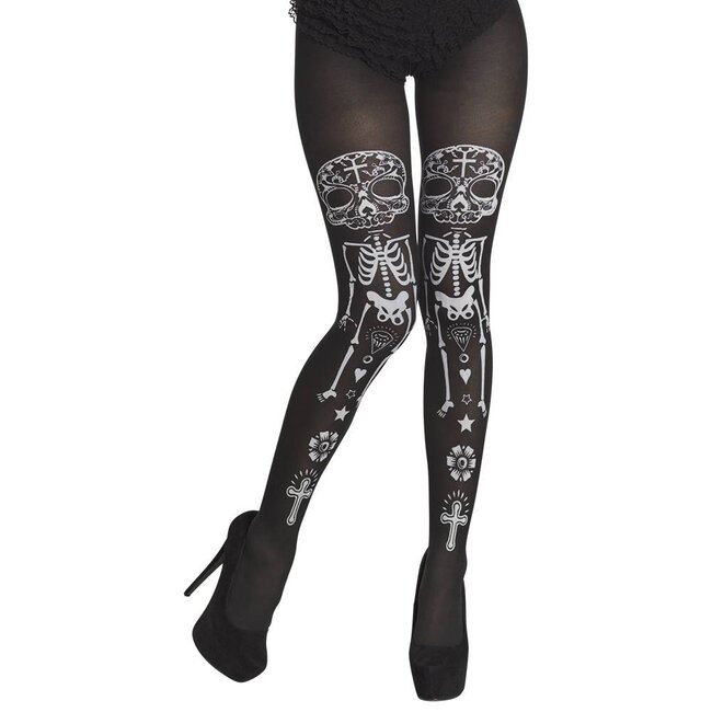 Zwarte panty (50 denier) met witte skeletten print. Lees meer.