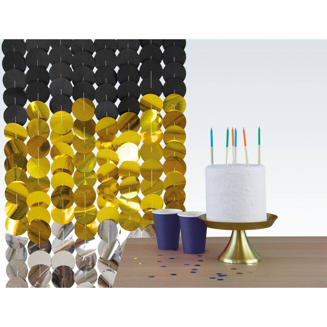 Met 8 slingers vol zwarte, gouden en zilveren cirkels maak je eenvoudig een chique backdrop van 170x80 cm. Perfect voor verjaardagen en themafeesten