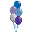 Ballondecoratie van 5 heliumballonnen in stoere blauw, paarse & zilveren kleuren aan een gewichtje.