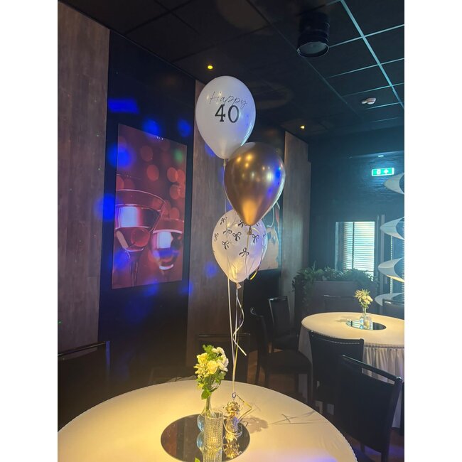 Witte & Chrome gouden ballonnen waarvan 1 met leeftijd opdruk naar keuze aan een gewichtje.