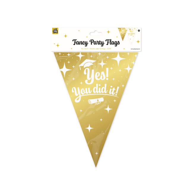 De luxe combinatie van glanzend goud en wit geeft een chique uitstraling die past bij elke viering van succes. Of het nu gaat om een diploma, examen, rijbewijs of een andere mijlpaal: deze vlaggenlijn maakt het moment extra speciaal en zorgt voor een feestelijke sfeer.